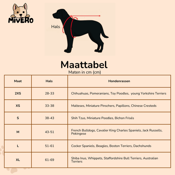 De nekband is beschikbaar in verschillende maten voor kleine tot grote honden. Meet de nekomtrek van je hond voor een perfecte pasvorm. Zit je tussen twee maten? Kies dan voor de ruimere optie voor extra comfort.